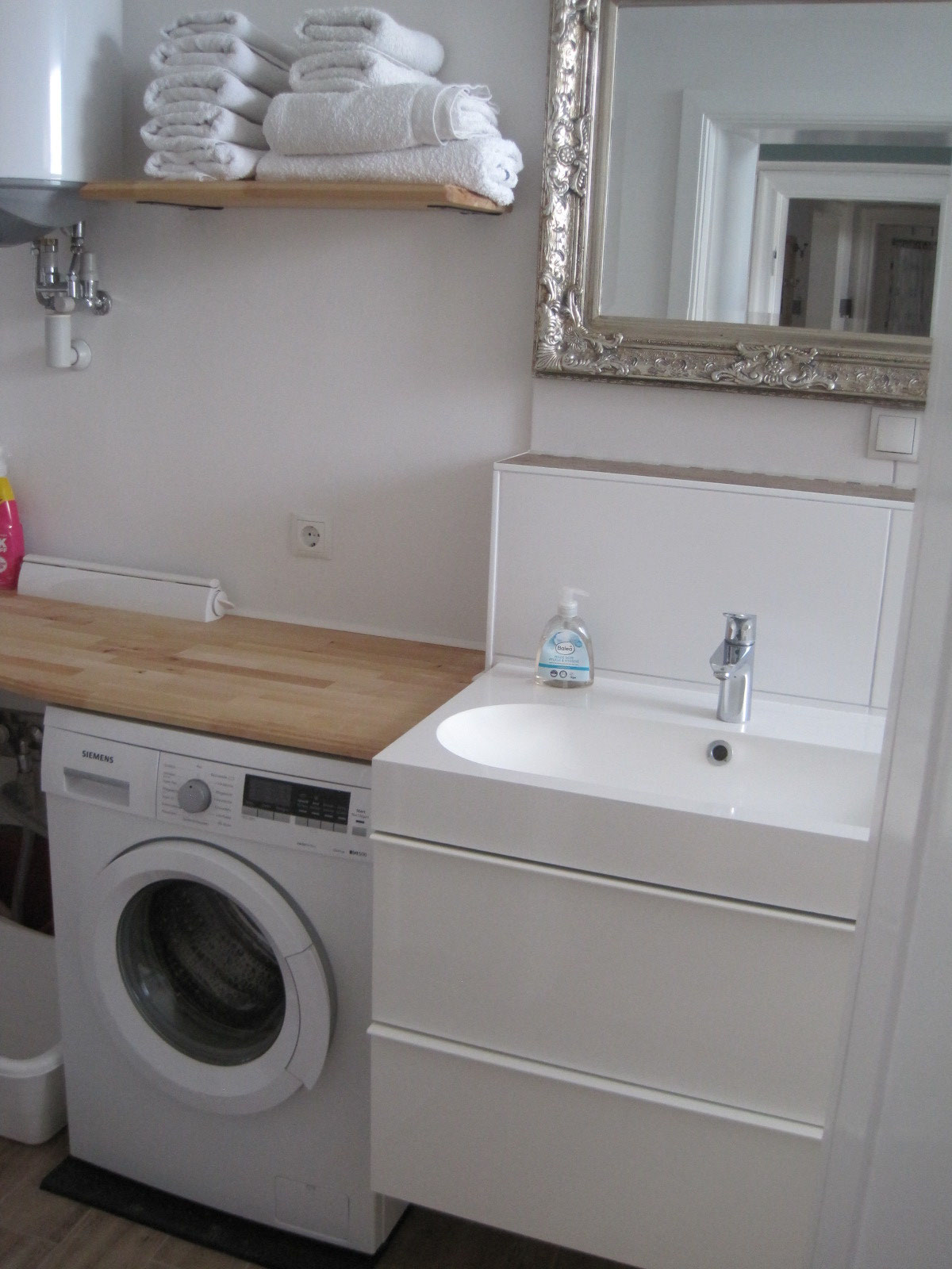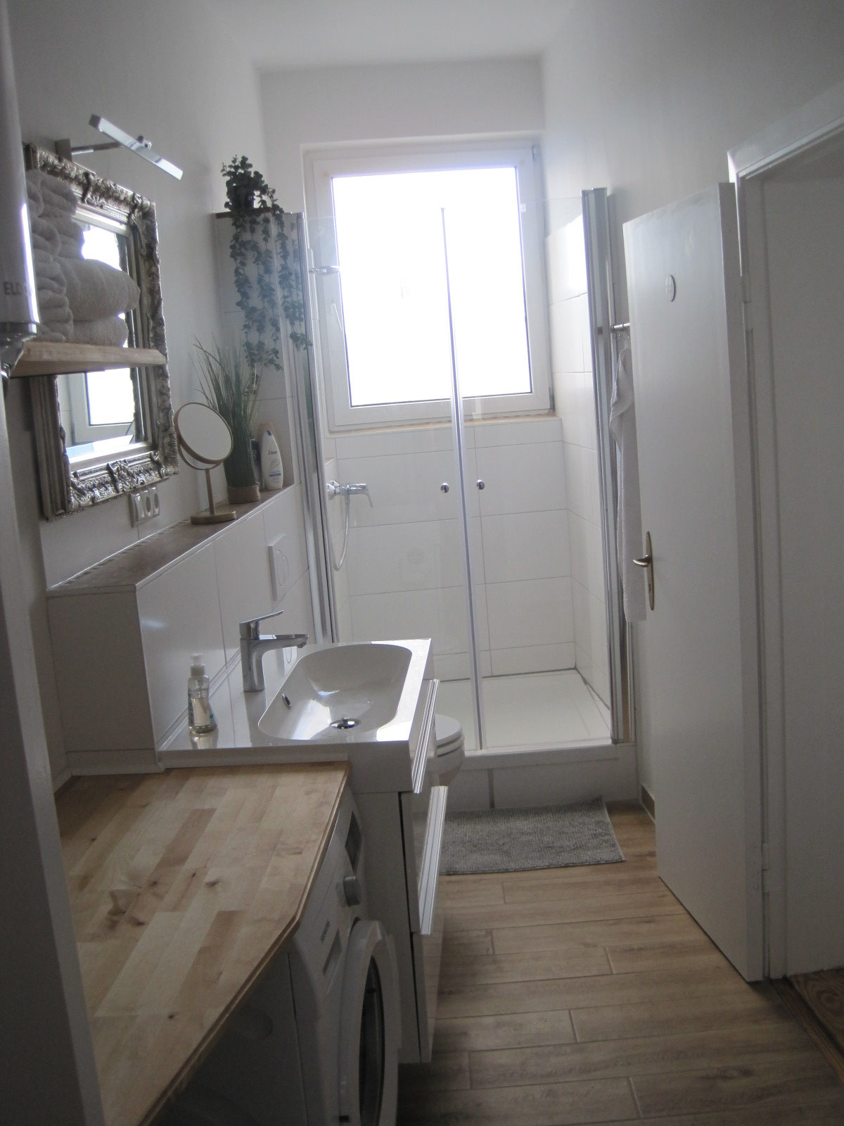 Duschgel, Shampoo und Toilettenpapier ausgestattet und verfügt über ausrechend Ablagefläche und Stauraum. Waschmaschine, Bügelbrett und Bügeleisen sowie ein Kosmetikspiegel und