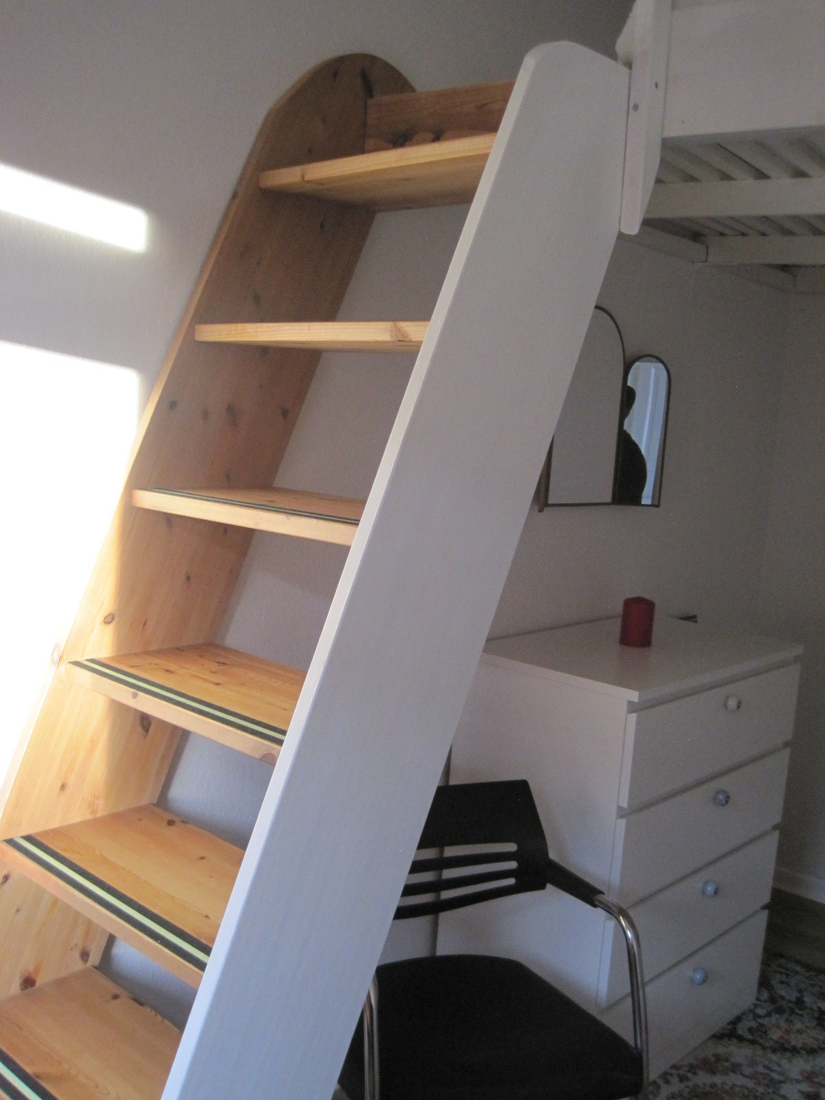 eine besondere Schlafmöglichkeit bietet, aber auch Platz für einen Erwachsenen hat. Ein Schreibtisch ermöglicht aber auch die Nutzung als Arbeitszimmer.
