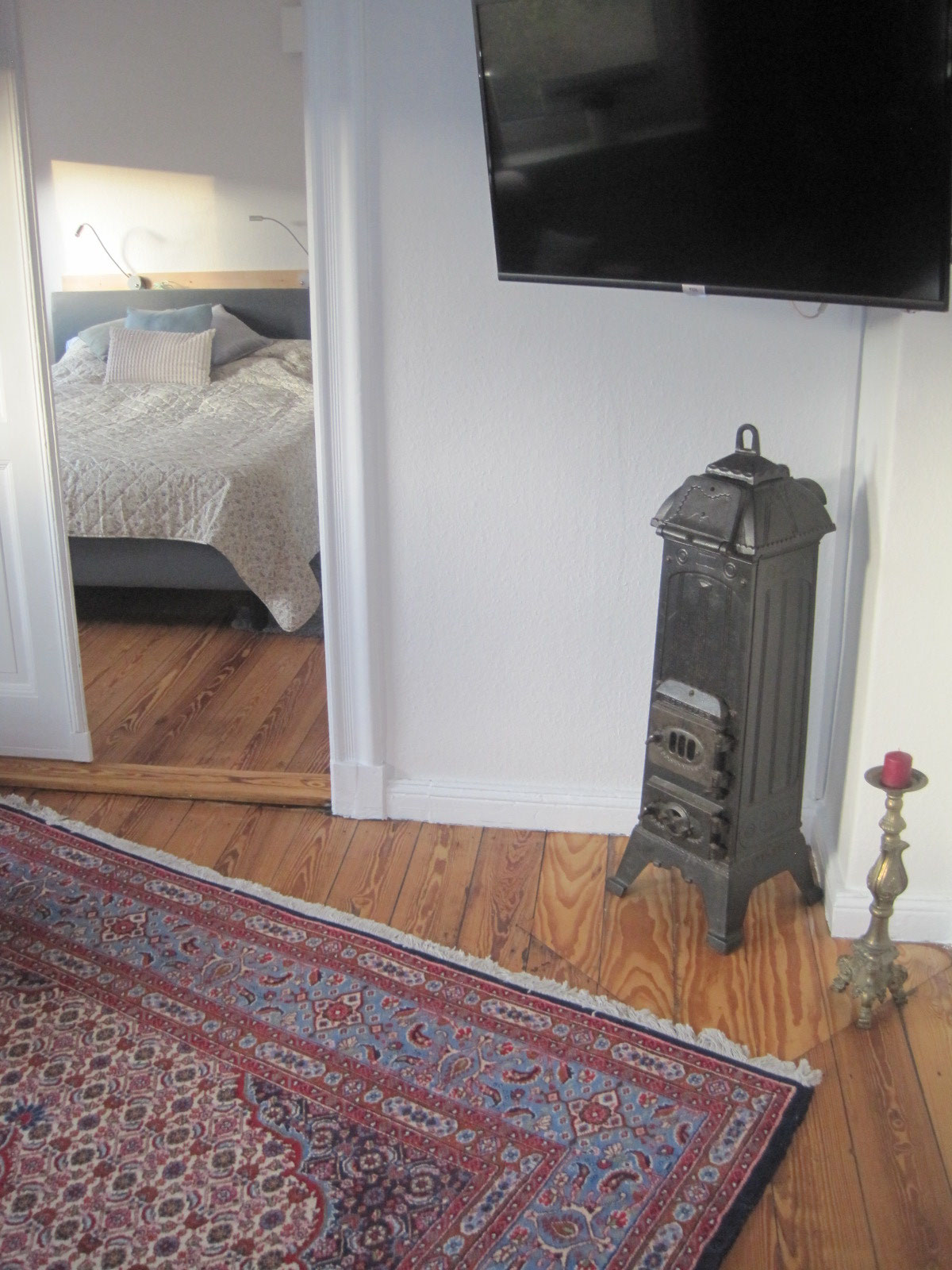 Die hohen Decken, der alte aufgearbeitete Dielenboden und restaurierte Türen verleihen der Wohnung einen besonderen Charme. Die