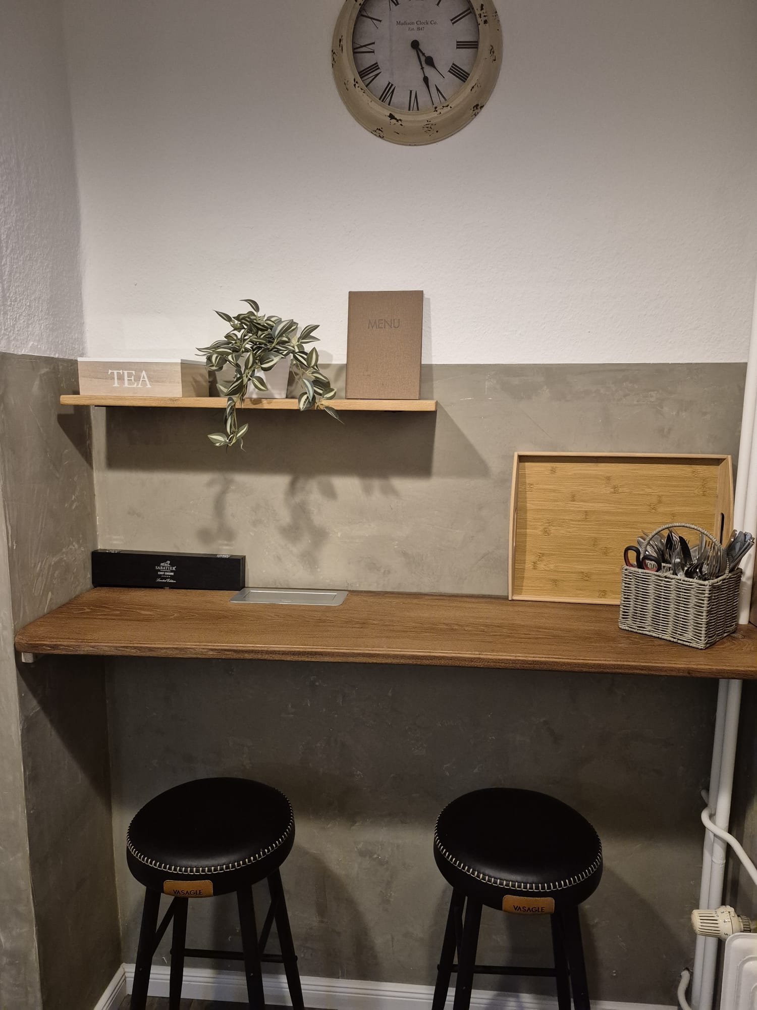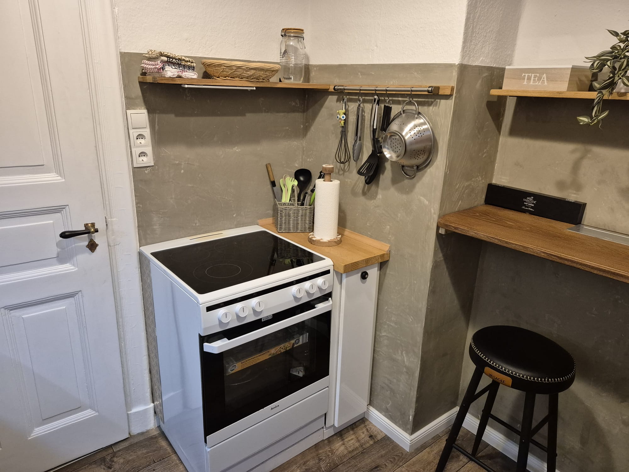 und einen Geschirrspüler. Des Weiteren ist sie mit Backofen, Ceranfeld mit vier Kochfeldern, Mikrowelle, Toaster, Kaffeemaschine und Wasserkocher ausgestattet. Geschirr und eine